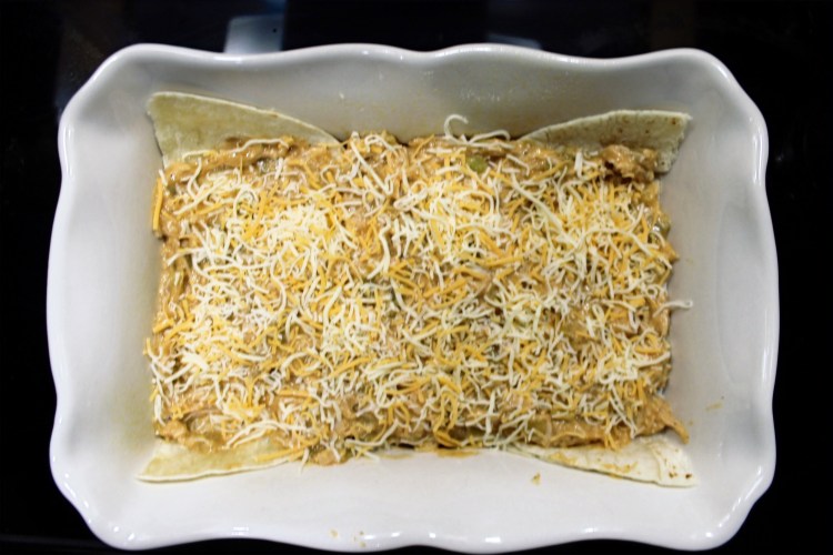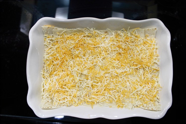 11. When all of the chicken mixture is gone, lay down one more layer of tortillas and sprinkle on the rest of the cheese.