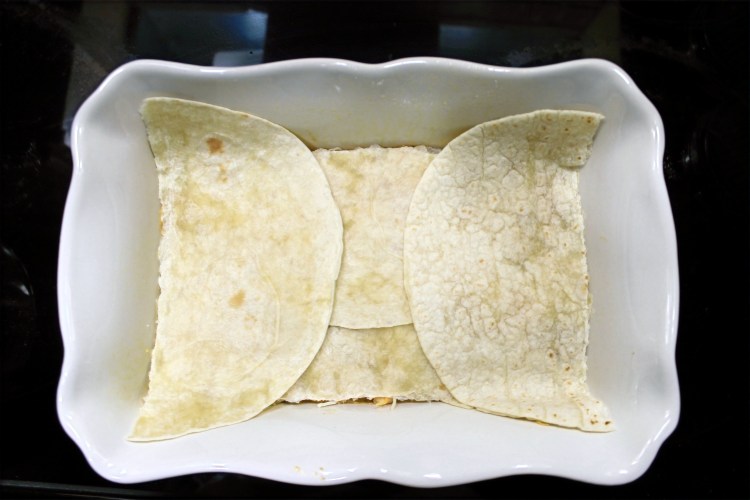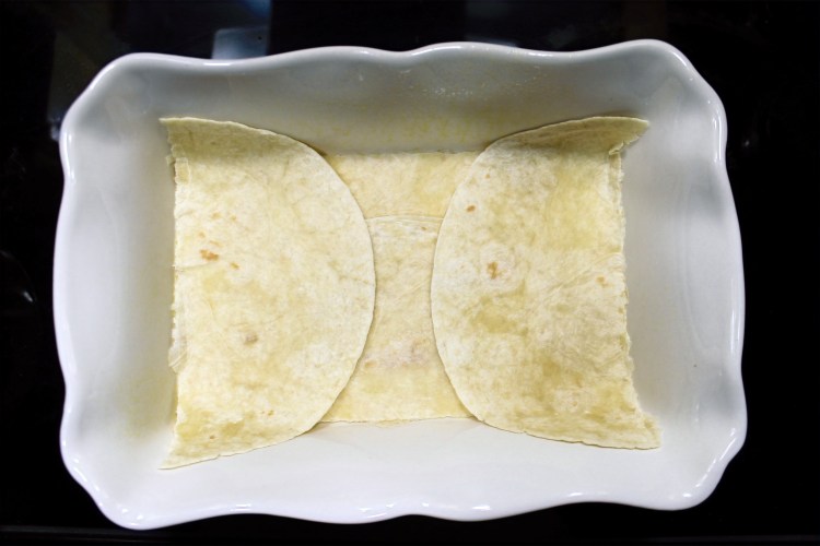 7. Lay two halves in the dish long ways and then lay two more halves on the short ends of the dish, so that the entire bottom of the dish is covered with tortillas.