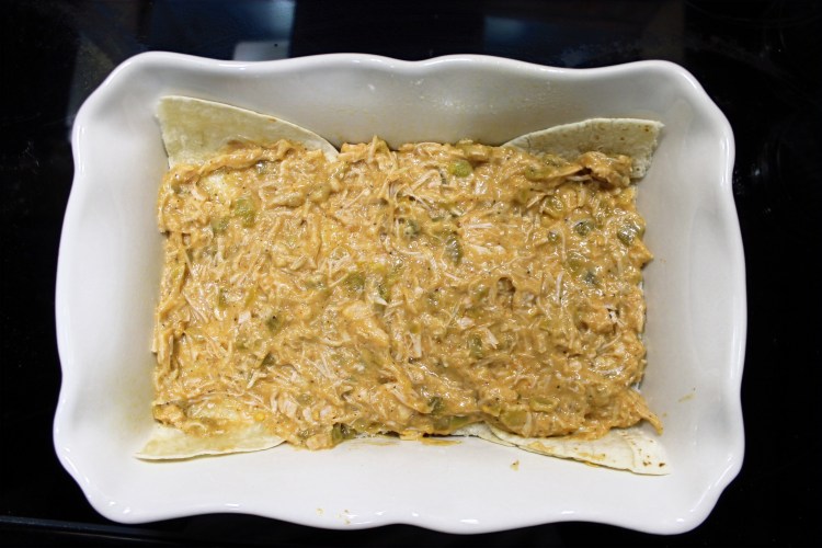 10. Lay down another layer of tortillas like the ones on the bottom. Repeat spreading on the chicken mixture, sprinkling with cheese, and layering the tortillas until all of the chicken mixture is gone, about 3 times.