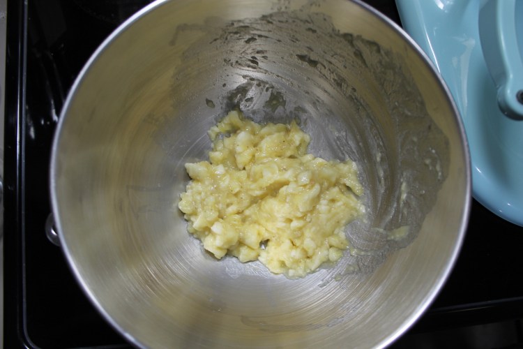 5. Mix the eggs one at a time, into the banana mixture, until well mixed.
