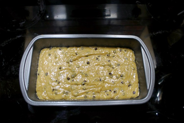 10. Scoop the banana bread batter into the greased and flour coated pan.