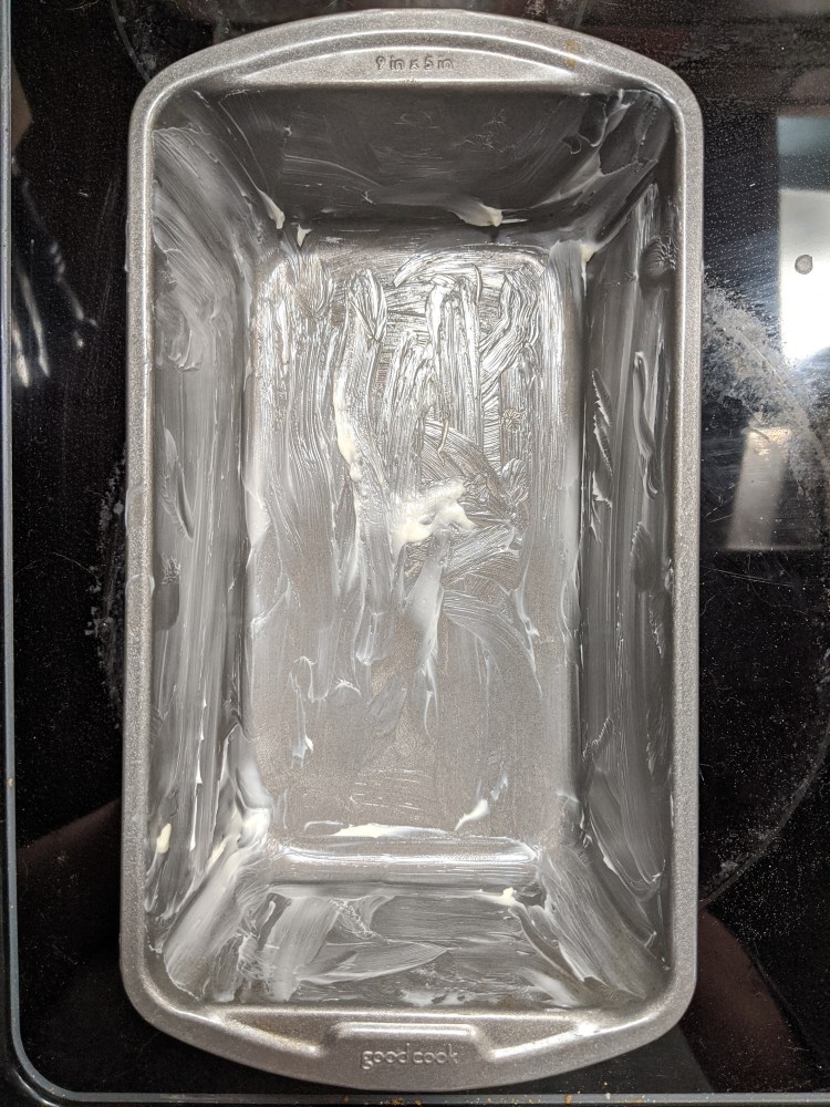 8.Grease the loaf pan well with the 1 tbsp of softened butter. I find the best way to do this is to wash and dry your hands, grab the piece of softened butter, and just wipe it all around in the pan, being sure to get the corners and the bottom.