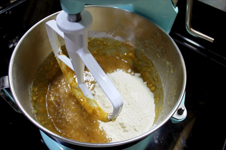 6. Mix in the flour mixture, one half at a time, mixing after each half is added, until just combined. Over mixing will make the bread hard. Be sure to scrape the sides of the bowl with a rubber spatula between additions to make sure you get everything mixed in.