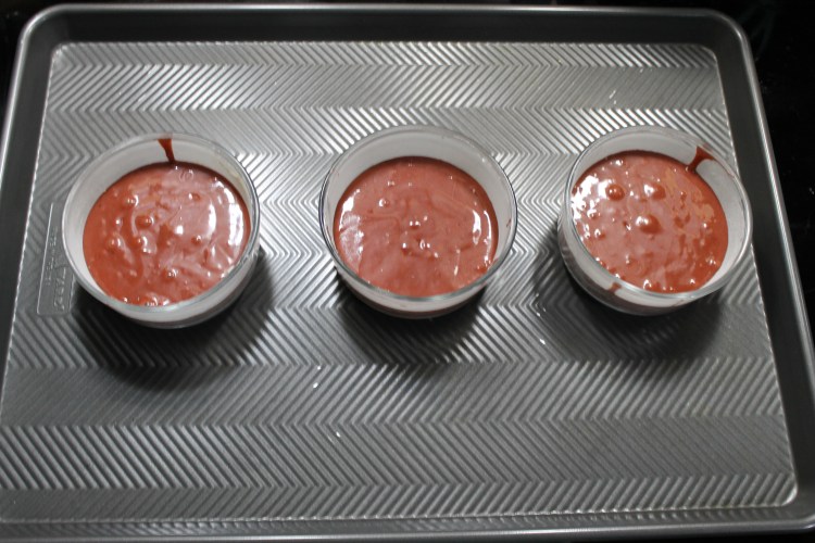13. Pour your red velvet cake batter evenly into each dish, about half way full.