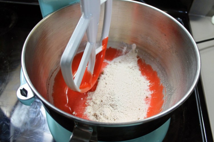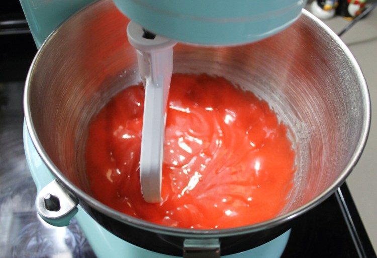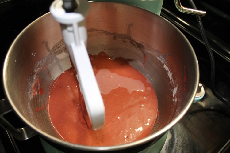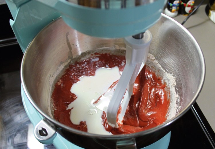 5. Add about 1 tsp of red food coloring to the bowl and mix. Keep adding food coloring until you get your desired color. Keep in mind that once you add the flour mixture, the batter will darken some.