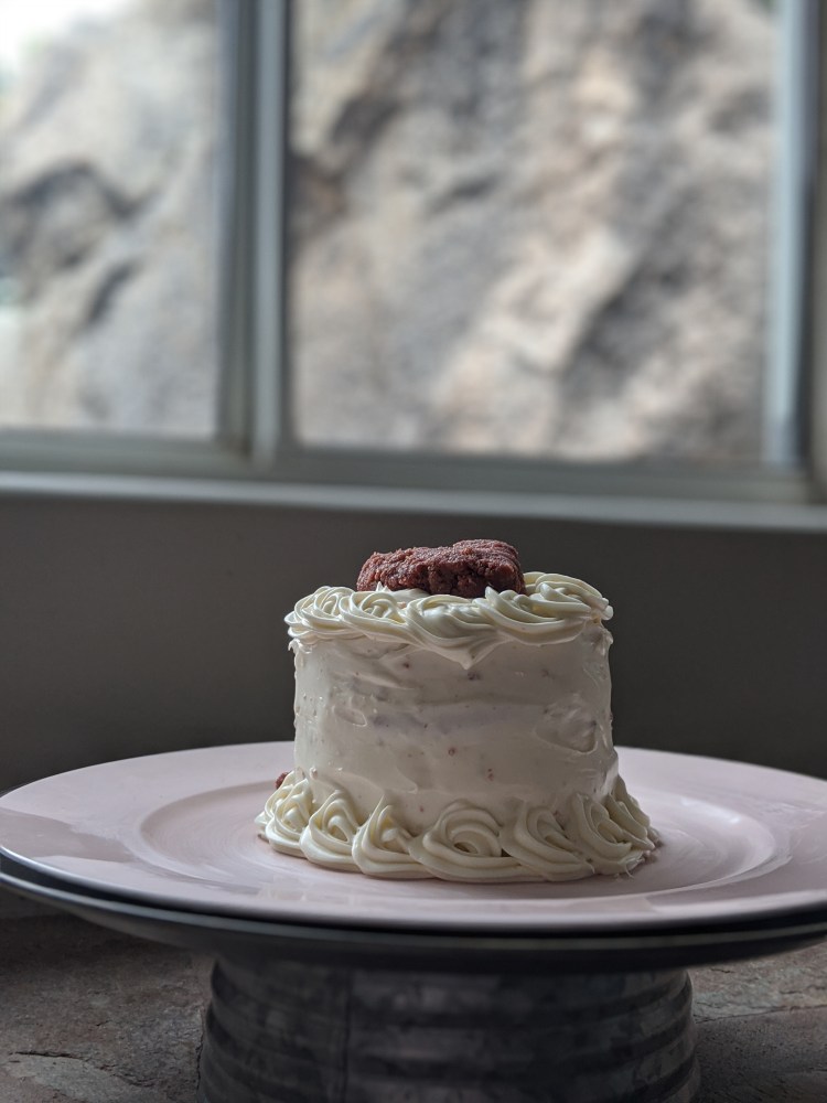 Valentine’s Day is just a few days away! Whether you are spending it with a special someone, a couple of friends, or even just treating yourself, this cake is just the right size! I’m a sucker for red velvet cake, and pretty much anything involving cream cheese. Sometimes a full size cake or a ton of cupcakes is just too much for two people, or even a small group of three or four, but we shouldn’t let that stop us from having a special treat for Valentine’s Day or any day when a delicious, perfectly moist red velvet cake is necessary… a.k.a ANY DAY. Anyway, I decided to make this recipe for this mini cake so that it can be enjoyed by two, a few, or just you, without having an excessive amount of cake taunting you all weekend! Full disclosure, I am NOT a talented cake decorator, though I have been practicing! But what this cake lacks in style, it makes up in deliciousness!