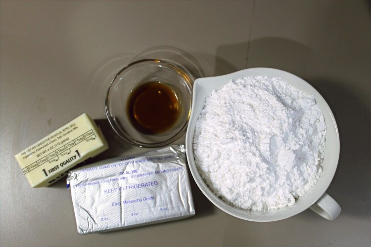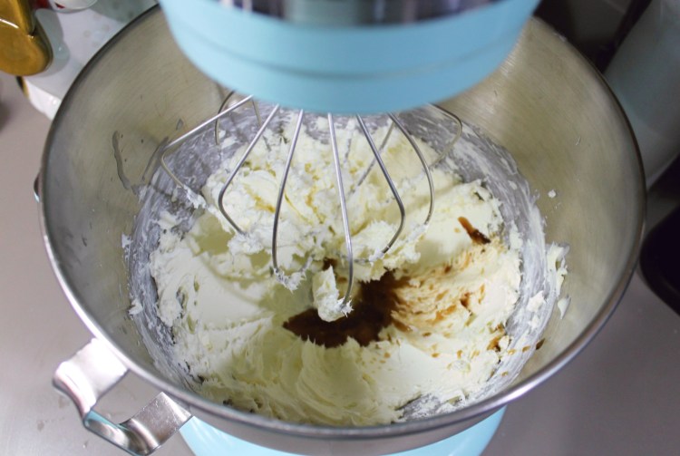 3. When the ‘wet’ ingredients are mixed well and fluffy, start adding the powdered sugar a little at a time. Continue mixing and adding in the sugar until all of it is added in. If the frosting seems a bit dry, you can add in a splash of milk or heavy cream and mix it until fluffy again.
