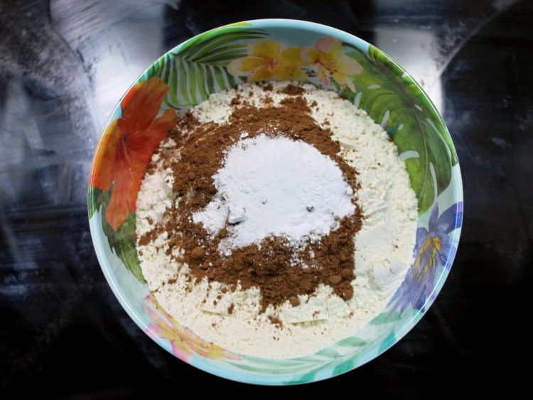 2. Stir together the 1 1/3 cups of flour, the cocoa powder, baking soda, baking powder, and salt in a small bowl.