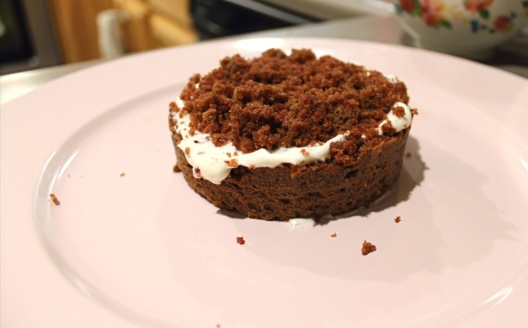 3. Plop a dollop of cream cheese frosting on top of your base layer. Spread around evenly.