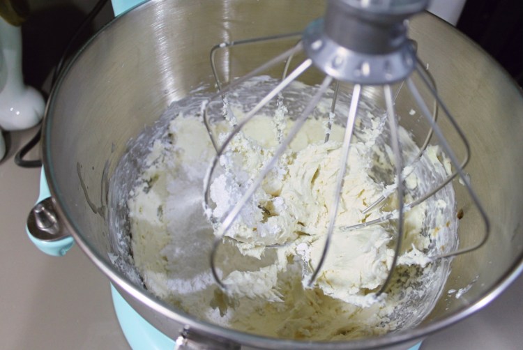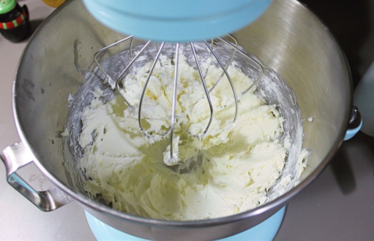 1. Beat the room temperature cream cheese and the softened butter together in a mixing bowl until it is fluffy. I used the whisk attachment on my stand mixer, but if you don’t have this, a handheld mixer on medium should do the trick!