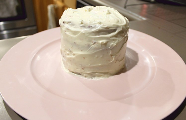 6. Put a huge dollop of cream cheese frosting on top of the cake and spread it out. Then spread it down the sides a little bit. Add more frosting to the sides and smooth it until the entire cake is frosted and smooth.