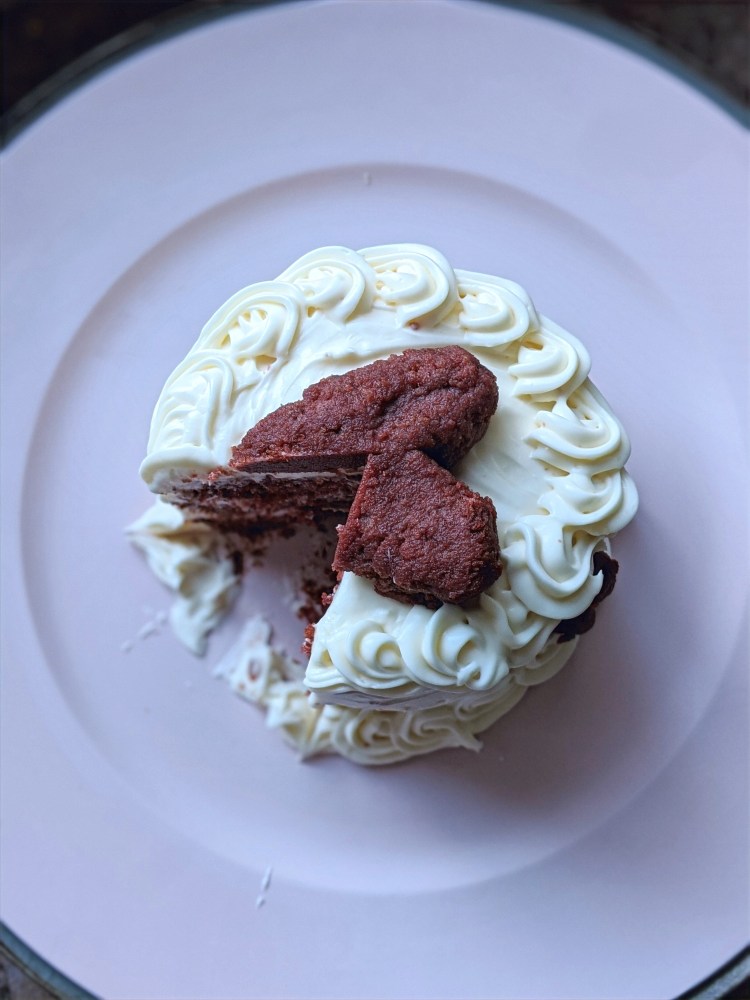 4. Crumble up the leftover tops and bottoms in a bowl and sprinkle some of these crumbles onto your cream cheese frosting.