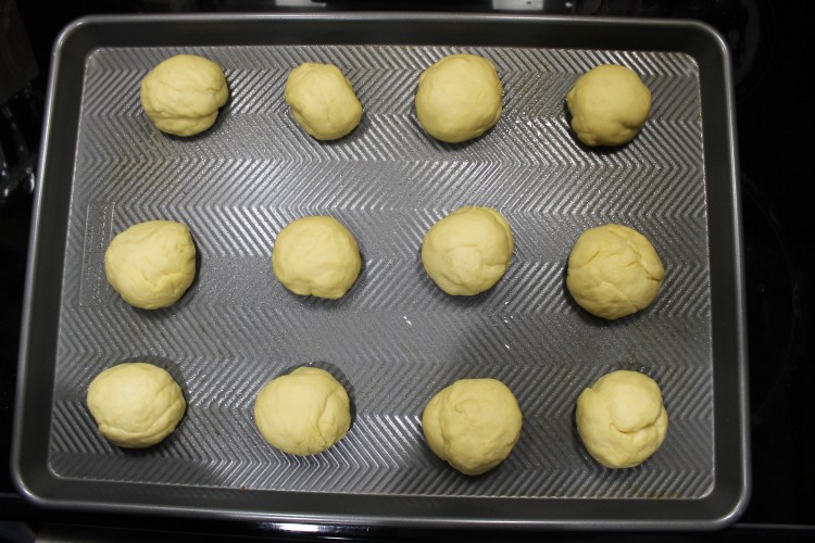 13. Next, you’ll want to grab a handful of dough and pull it apart from the rest of the dough. Roll it in your hands until you have a nice ball shape. The ball should be about 3 inches wide. Place the balls on the greased baking sheet, about 2 inches apart. Keep going until you have used all of the dough. You should get about 12 dough balls.