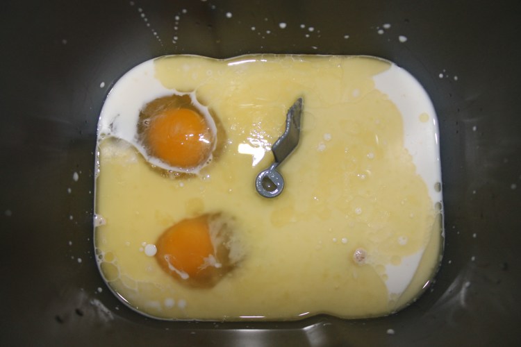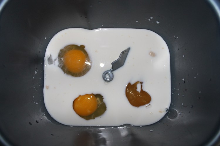 4. Pour the milk-yeast mixture into your mixing bowl. In my case, it is the pan for the bread maker with the mixing hook attached at the bottom.