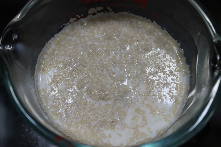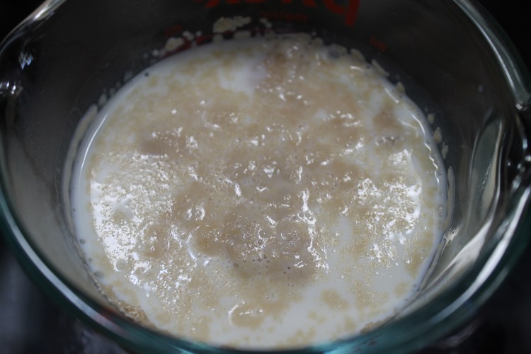 3. Let the milk and yeast mixture sit for 5-10 minutes. Be sure not to disturb it during this time. I like to leave it in the microwave, without turning it on, during this time so that it stays in a warm, moist environment to help the yeast activate. After the 5-10 minutes, the yeast should look a little foamy, as shown below. It may not look like a lot is going on with it, but as long as it is a little foamy, that means it’s working.