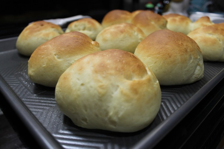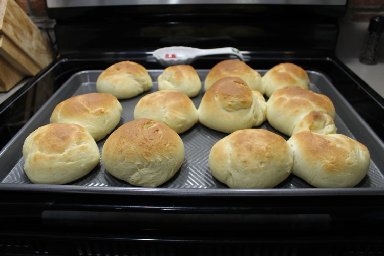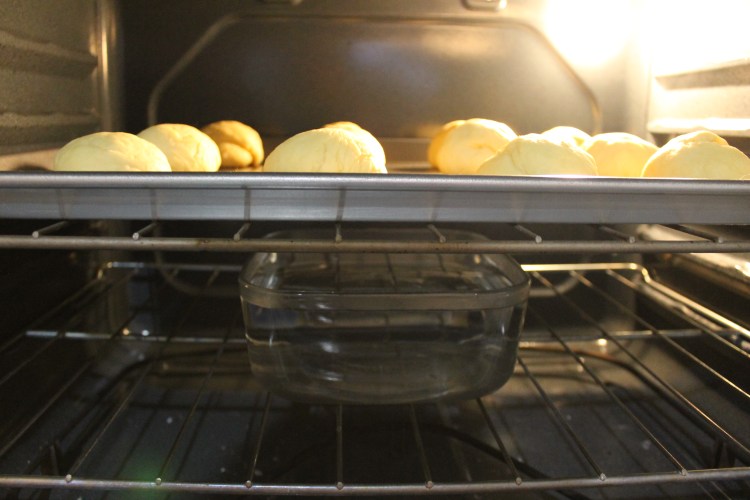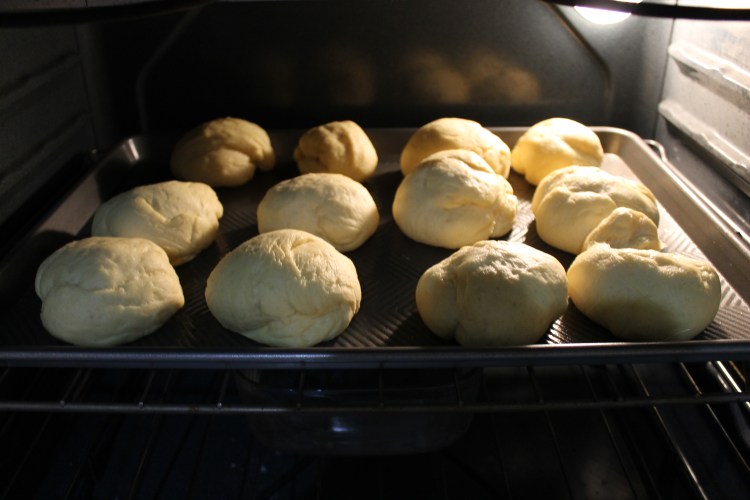 14. Let the rolls rise in a warm place for 2 hours with a warm, damp towel over them. My house is pretty cold this time of year, so I have a hard time getting things to rise just out on the counter. So, I get a big bowl full of water as hot as I can get from the tap and place it on the bottom rack in the oven. Then I place the tray of dough balls, uncovered, on the rack above it and let them rise in the oven that way. I don’t turn the oven on because the ideal temperature for rising the rolls is 75℉ and the oven doesn’t go that low. But, I have found that with the bowl of hot water in there and leaving the door closed, the inside of the oven will be about that temperature. So if your house is not around 75℉, I would recommend doing this trick of the hot water in the oven.