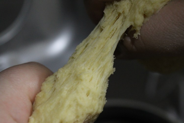 9. Bread maker, mixer, or by hand, be sure to be scraping the bowl as you mix the dough so that every piece of the ingredients are added in. When the dough has formed a solid ball, IF it seems a bit dry (which mine did, see below), you can add a 1/2 tbsp of water and continue mixing (picture 2). Alternately, if the dough seems too sticky, you can add 1 tbsp of flour.