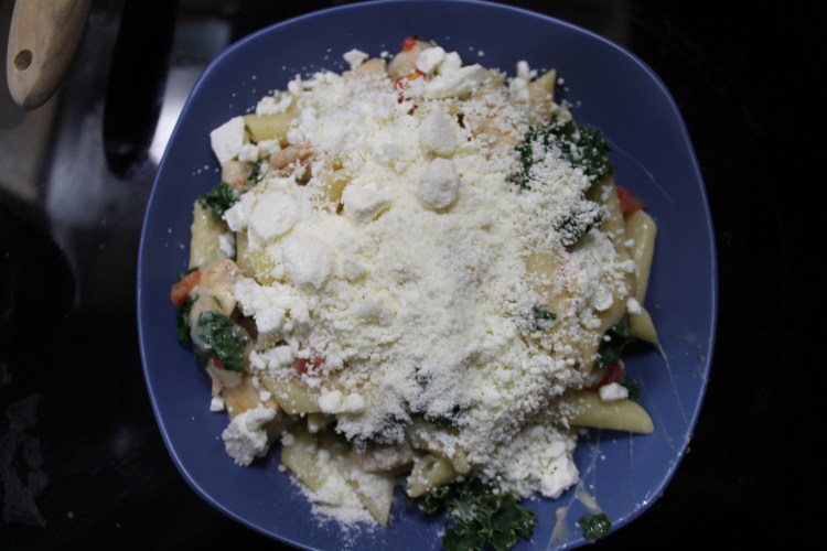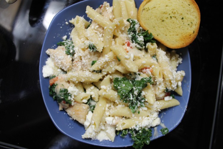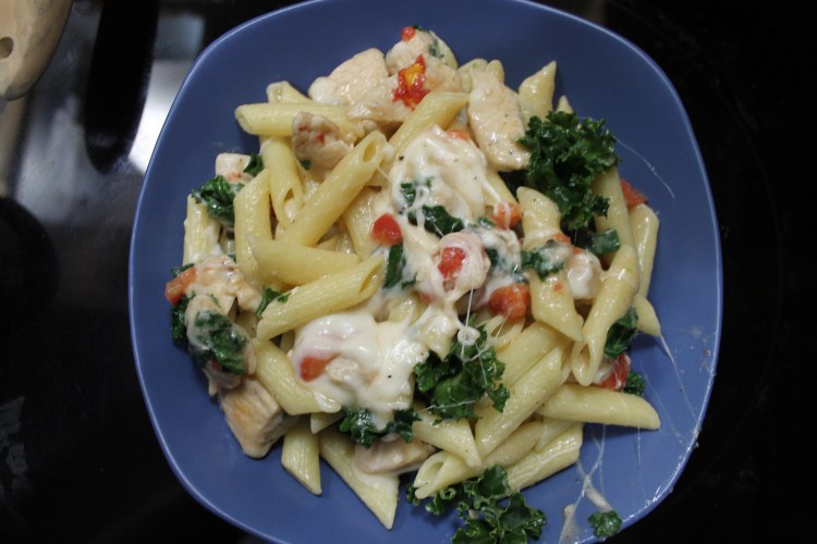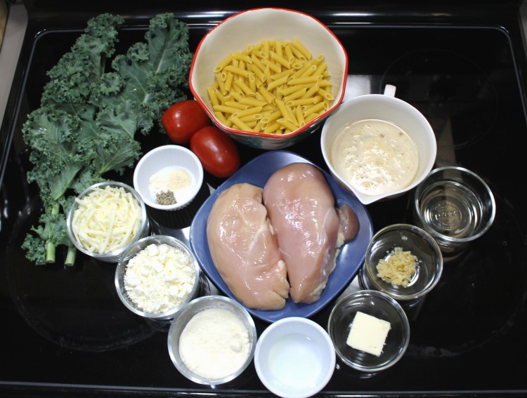 This recipe is SO good you guys. It is my favorite recipe right now. The hubby and I eat it almost every week. It has all of our favorite things: pasta, kale, chicken, and LOTS of cheese, three different kinds to be specific! I can’t take 100% credit for this recipe. I found it originally in one of my Pioneer Woman cookbooks, but of course I had to make some modifications because I can never leave anything alone💁♀️ So credit to my hero, Ree Drummond, for inventing the basis of this recipe. Anyway, it’s seriously delicious so let’s get to it!