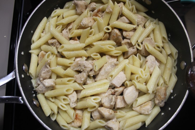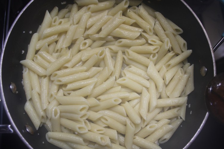 1. Set a pot of water to boil and let the pasta cook until al dente (can be boiled while you cook the rest of the meal so that the noodles are drained and still hot when it is time to add them in to the rest of the meal).