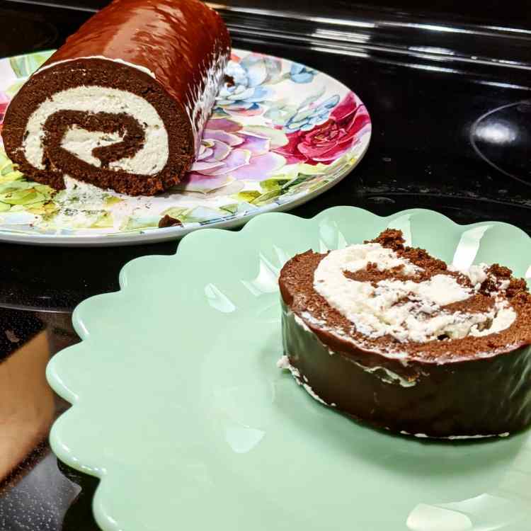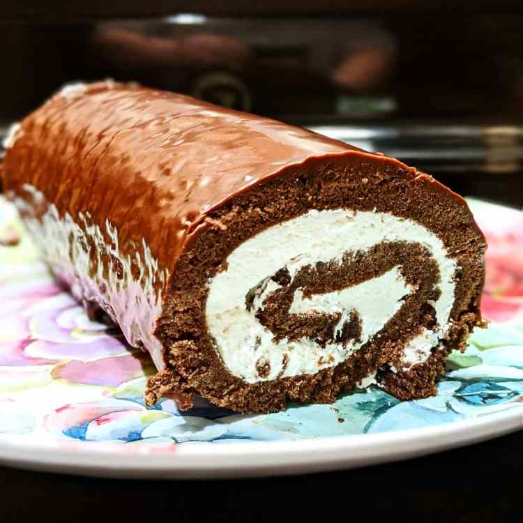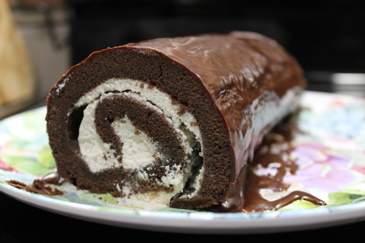 18. When the mixture is cooled and thickened some, spoon it all over the rolled up cake. Spread it around so that is even.