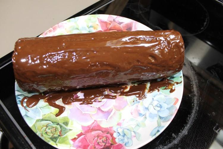 19. When you have covered the entire cake in the ganache, remove it from the wax paper onto a plate and place in the fridge for at least two hours. (I forgot to leave the wax paper underneath this time, so I just took the cake off the plate when it came out of the fridge and I cut the ends off, cleaned the plate, and put it back on the plate.)
