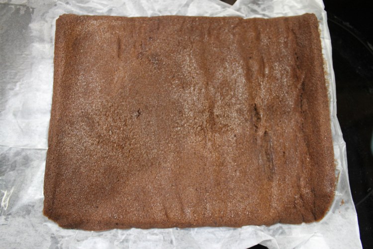 8. When the cake has finished baking, immediately flip it over onto the wax paper. Then carefully roll the cake up. It may crack a bit, this is okay!