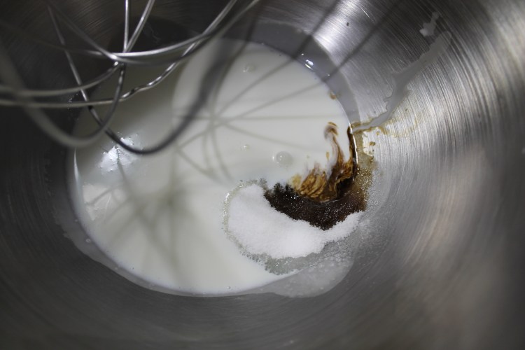10. While the cake is cooling, make the filling. It is a simple whipped cream filling. Pour the 3/4 cup heavy cream, the sugar, and the vanilla into a mixing bowl on a stand mixer fitted with the whisk attachment. If you don’t have a stand mixer with a whisk attachment, you can whisk by hand or use a hand mixer on high speed.