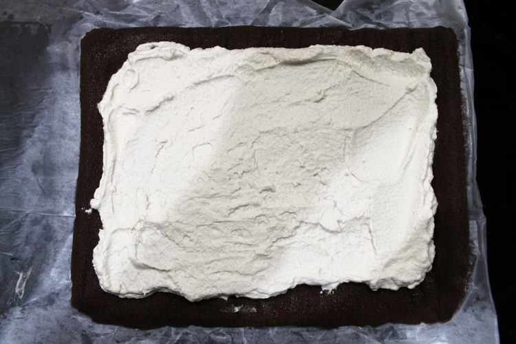 12. When the cake has cooled COMPLETELY, unroll it and spread the entire bowl of whipped cream over the cake, leaving a one inch margin around the edge so when you reroll the cake, the filling doesn’t squish out as much.