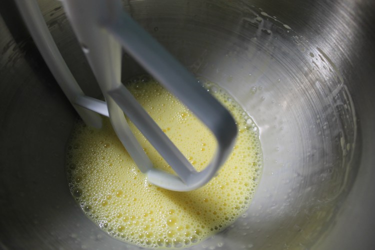 11. Whisk the ingredients on medium-high with the stand mixer until stiff peaks form and the mixture is fluffy.