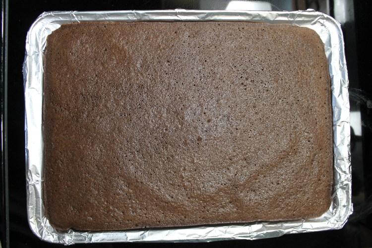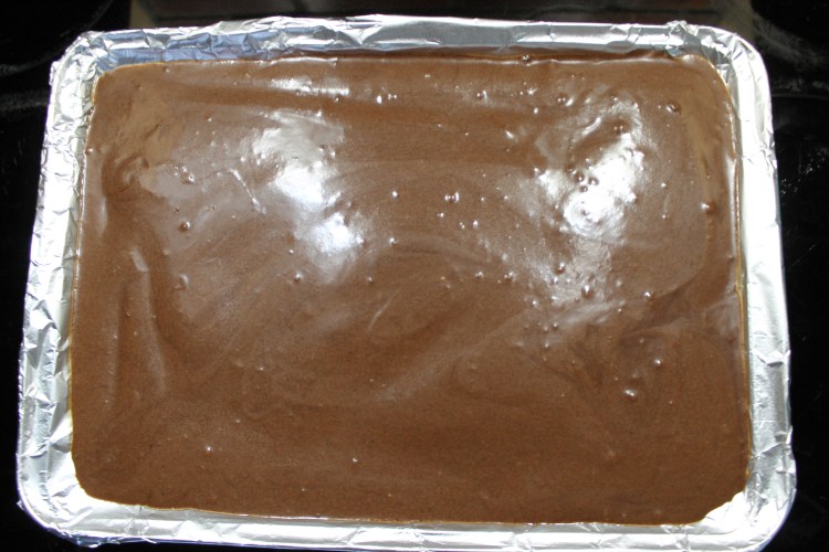 5. Cover a 9″ x 13″ baking sheet with foil and grease with cooking spray. Then dump the cake batter onto the pan and make sure it is reaching the edges of the pan and even.