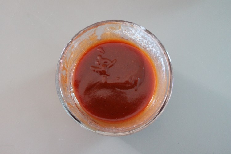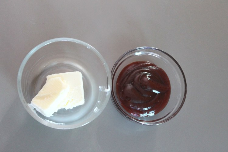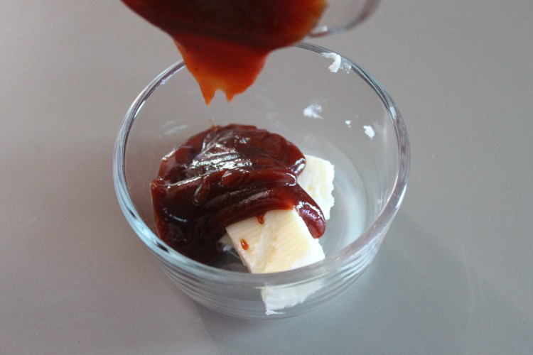9. After the ribs have been in the smoker for 90 minutes, put 2 tbsp of the butter and 1/4 cup of the barbecue sauce in a microwave dish. Microwave until the butter has melted, about 30 seconds, and mix together to combine into a glaze.