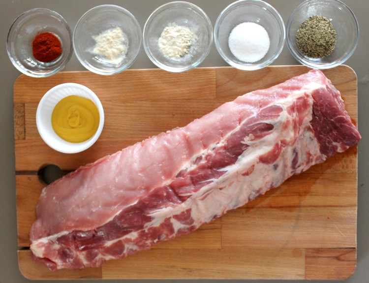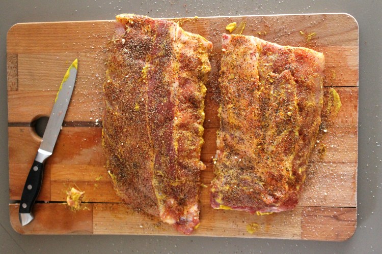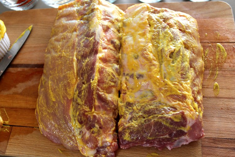 5. Next, spread the mustard over every surface of the ribs, be sure to get the bone side and ends too. (The mustard won’t leave any flavor when the ribs are done, it is only a binder to help keep the rub on.)