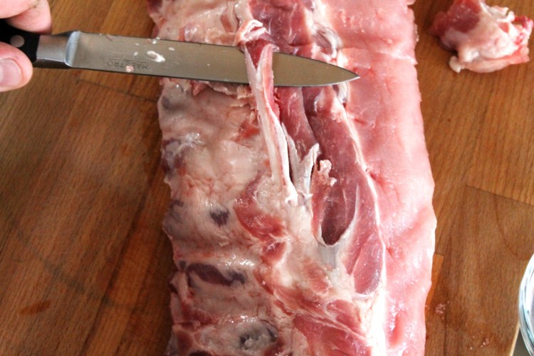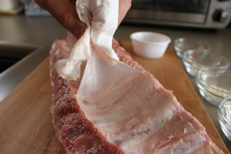 4. Remove the membrane from the bone side of the ribs. If you use a paper towel, it will help grip the membrane when pulling it off. Remove any excess fat at this time as well. (We cut the ribs in half at this point so that they fit in our smoker, but if yours is larger, this may not be necessary.)