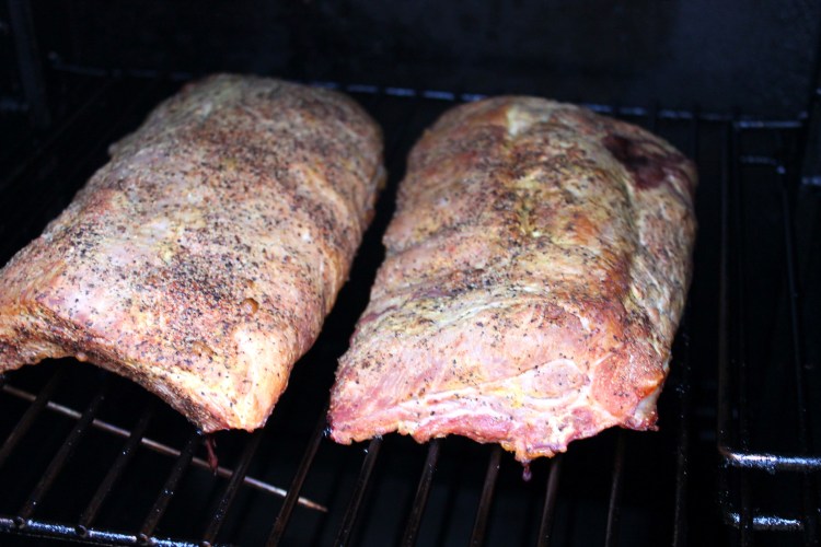 8. When the smoker has reached temperature, place the ribs bone side down on the rack in the smoker. Let them smoke for an hour and half (90 minutes).