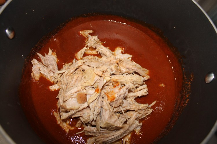 15. When the sauce is simmering and has thickened some, add the shredded meat in and then remove the pot from the heat. You should now have the masa, meat with sauce, and the corn husks ready for assembly.