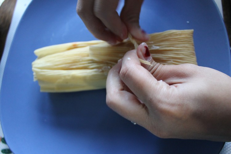 20. Find a small, unusable corn husk, and tear a strip off of it. Then use the strip to tie the tamale closed. A double knot seems to work fine.