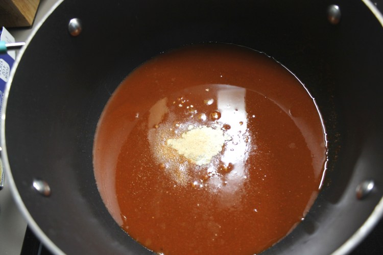 8. In a medium pot, add the chile sauce, onion powder, garlic powder, and salt. Then give it a stir.