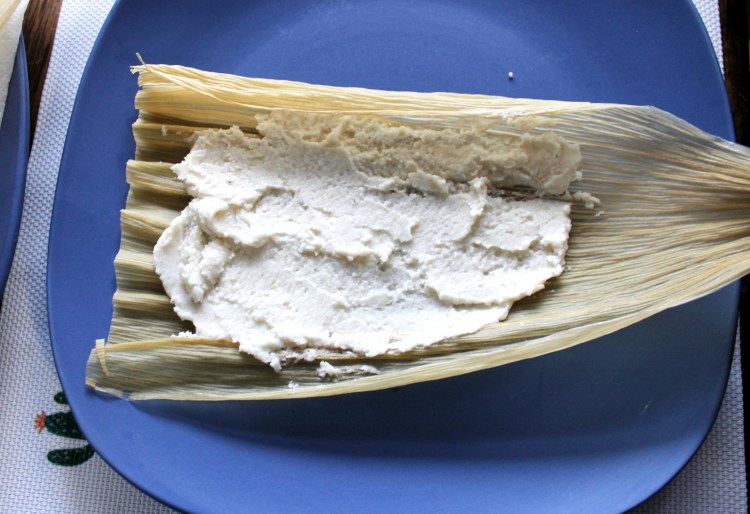 16. To assemble, lay a corn husk flat on a plate and spread about a spoonful of masa on the widest part of the corn husk.