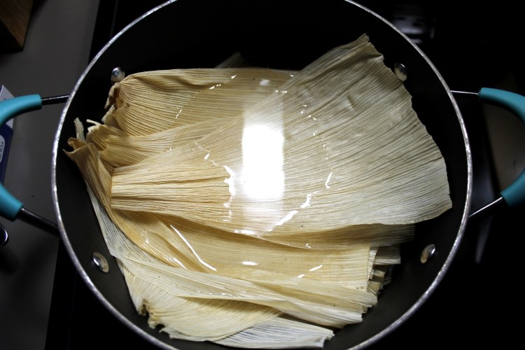 4. While the instant pot is doing the natural release, place about 16 corn husks in a pot and fill with water until the husks are covered. Boil them with a lid on for 20 minutes, or until they are soft.