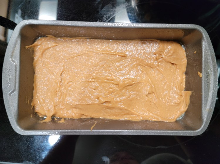 9. Pour the batter with the pumpkin into a well greased loaf pan and flatten it out across the pan.