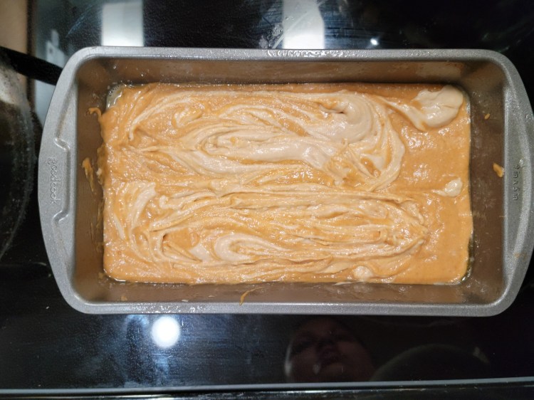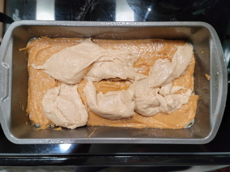 10. Drop spoonfuls of the cream cheese batter over the top until all of it is in the pan. Then swirl it into the pumpkin batter with a butter knife.