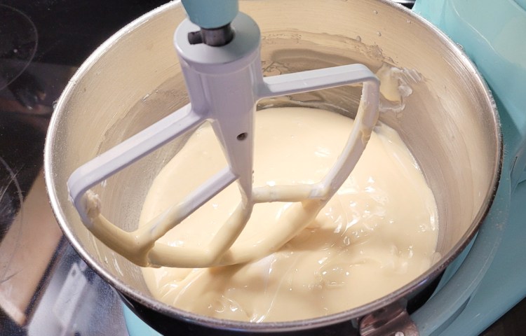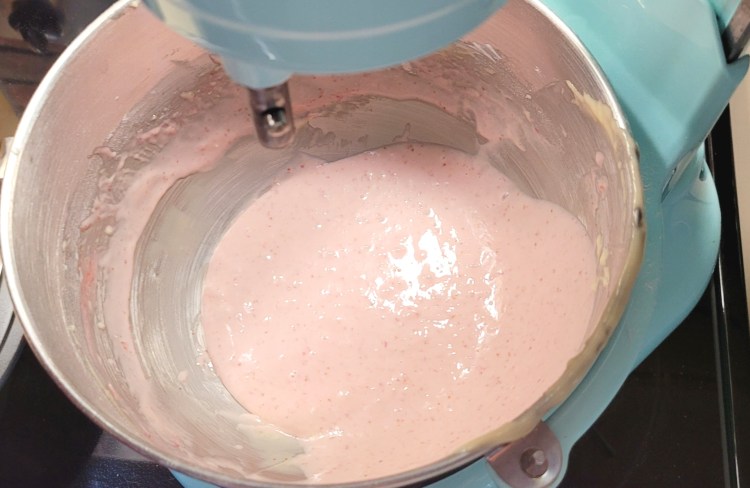 9. Add the blended strawberries to the third of batter in the mixing bowl and mix until just combined.