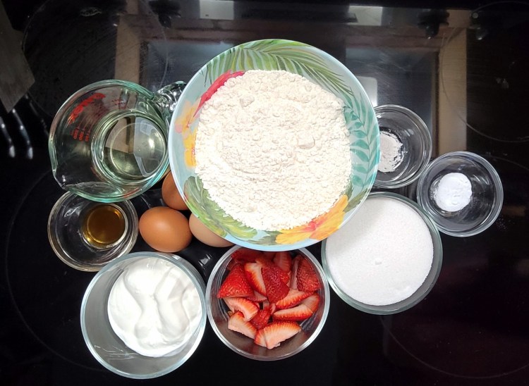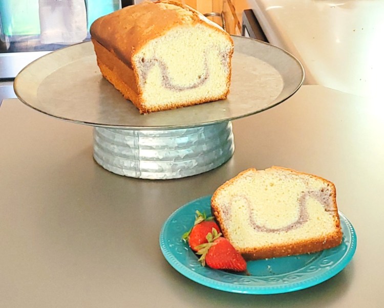 Just in time for summer I am sharing with you the recipe for this delicious strawberries and cream loaf cake! Firstly, I just want to address the fact that strawberry part of the cake is not very red. This is because the natural chemical in strawberries that makes them red breaks down during baking and makes them more of a purple-blue color. I don’t care too much about the color when the taste is this good! However, if color is important to you, you can add some red food coloring to get that pop. I talk about it in step 8, so just look out for that. Also, if strawberries aren’t for you or maybe you have some other fresh fruit on hand, I think you could substitute blueberries, raspberries, or something similar if you wanted. This cake is made with fresh fruit and is just the right amount of sweet. It’s dense, but just right. You could make a quick icing with powdered sugar and milk, or even serve it with some whipped cream, but it’s pretty delicious all on it’s own too. It’s the perfect summer treat and I hope you try it! Your friends, family, and stomach will be glad you did!