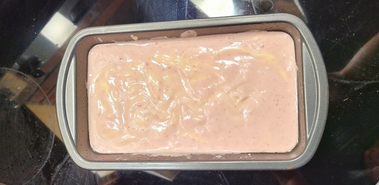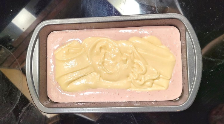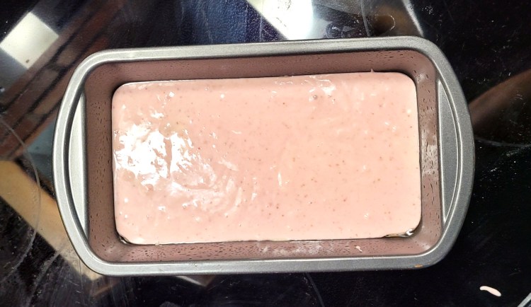 10. Pour the strawberry batter into the loaf pan on top of the plain batter poured in step 7.