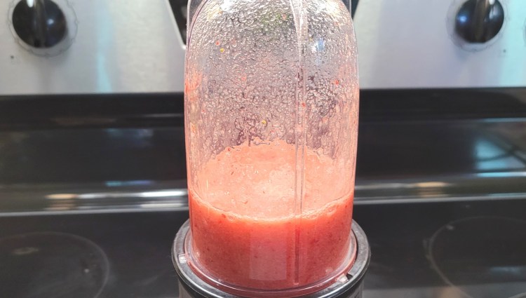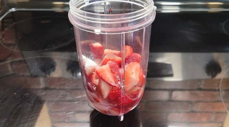 8. In a blender, put your strawberries and 2 tablespoons of sugar. Blend well.