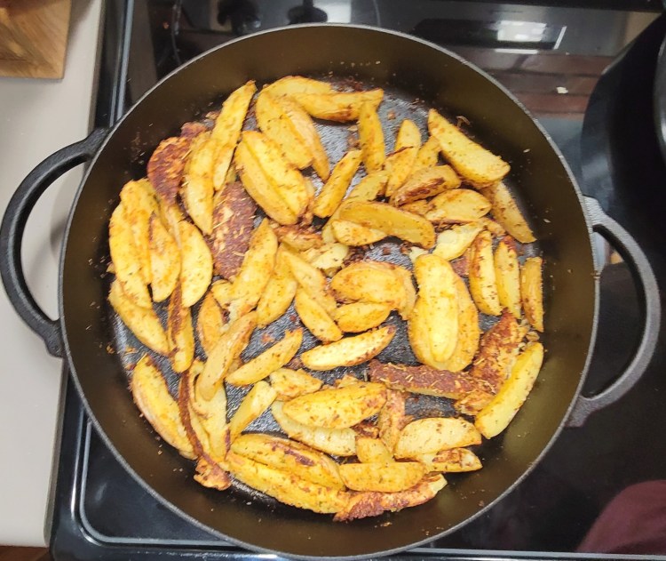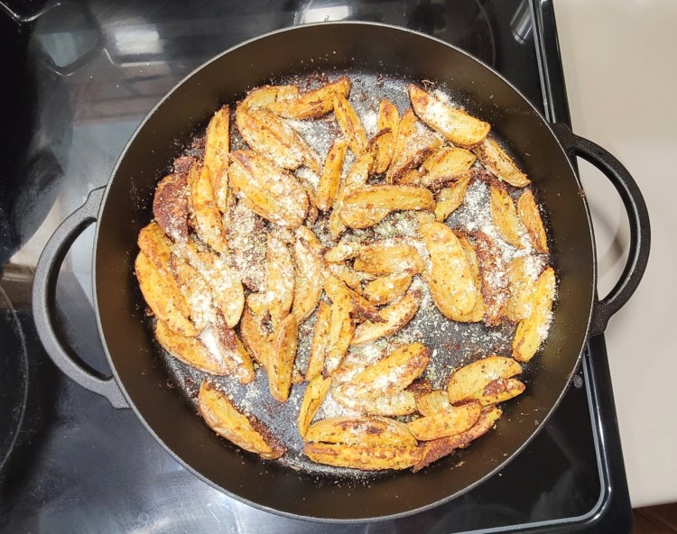 If you are like me, you love french fries. I could eat them every day. I love them in many ways. I like plain, salty ones. I like cheesy fries, or seasoned fries. I like skinny fries and steak fries. Basically what I’m saying is that I love fries and I don’t discriminate against any type of them. However, I have found that homemade fries can be difficult to get just perfect. Sometimes they come out not crispy enough or not salty enough, plus I hate deep frying things. So I prefer to bake them. Well, these fries turn out every time! They are super easy and take out the need to deep fry. I make them in a cast iron pan, but if you don’t have one, you can still roast them in a sheet tray. Let’s jump in!