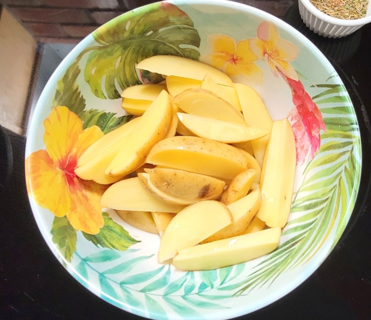 6. Pour about 2 tablespoons of the olive oil over the cut potatoes. Then toss to coat the potatoes thoroughly.