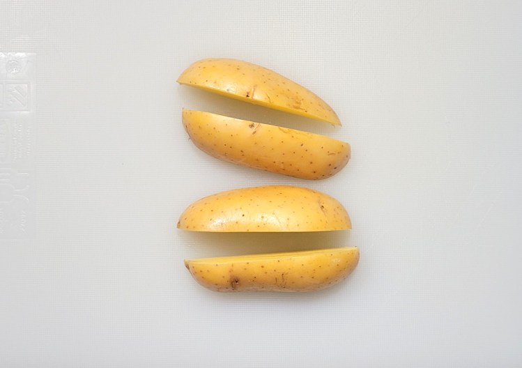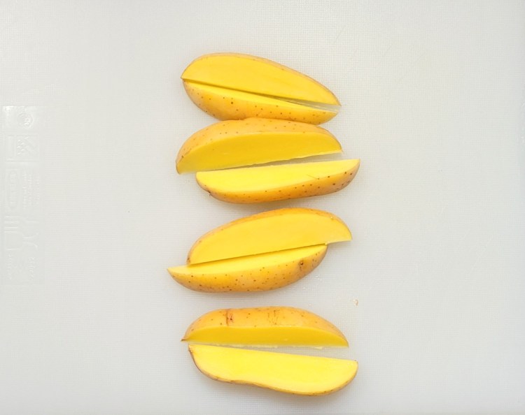 3. Cut them into sticks, by cutting each potato in half three times. Leave the peels on.