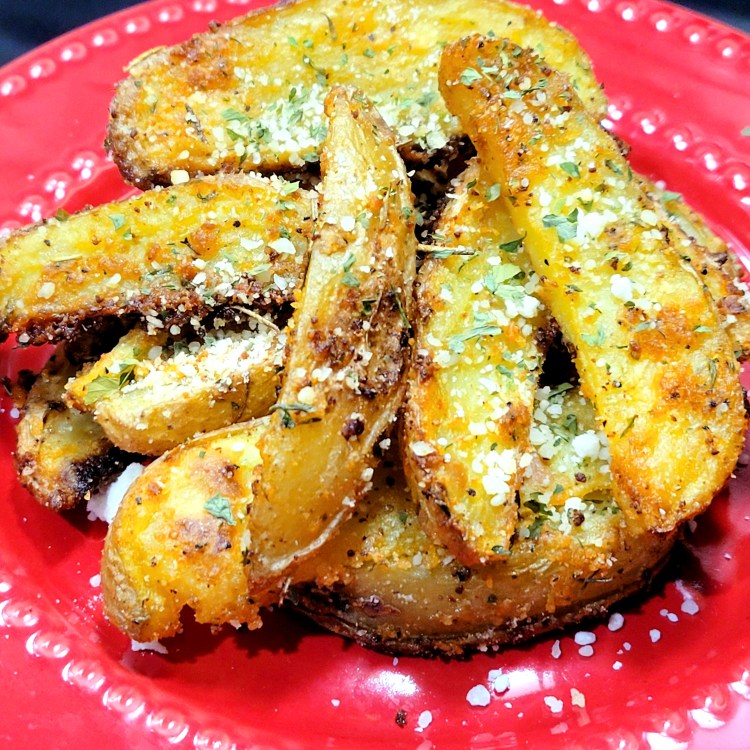 7. Next, sprinkle all of the seasonings and half of the grated parmesan over the potatoes. Again, toss well to thoroughly coat the fries in the seasonings.
