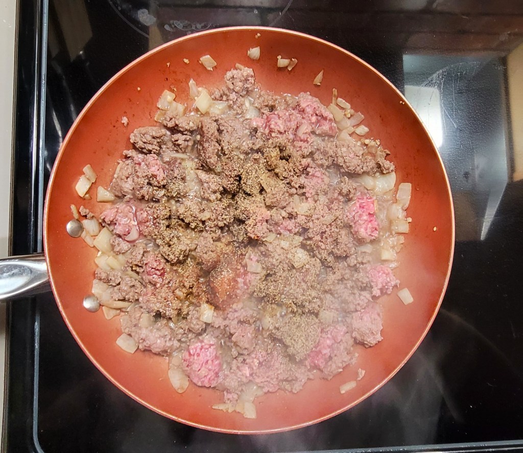 5. Add 1/2 tsp of salt, 1/2 tsp pepper, and 1/4 tsp of chili powder to the meat and continue cooking until the ground beef is browned.